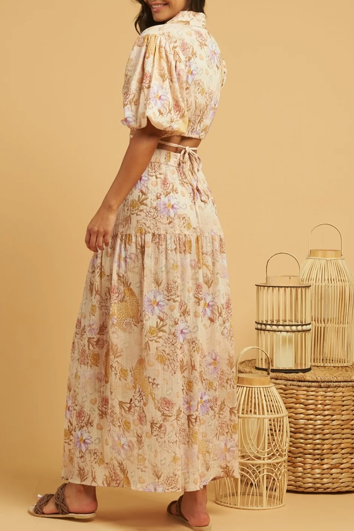 The top is a stunning work of art that is sure to elevate any outfit. The sides of the V-neck feature beautiful cotton trim that adds a touch of elegance to the design. Adorned with intricate prints of flowers and leaves, this top exudes a unique and captivating charm that will turn heads.