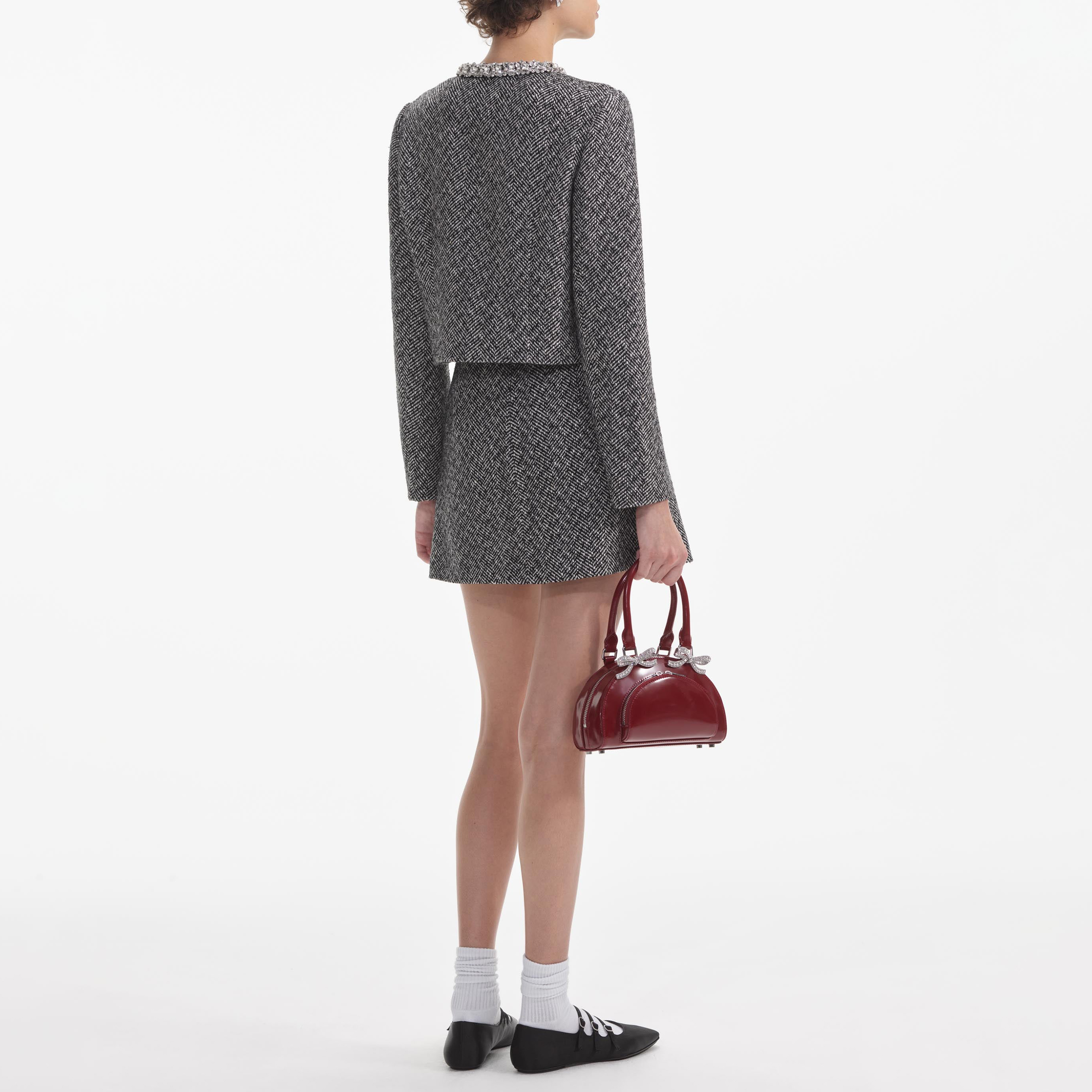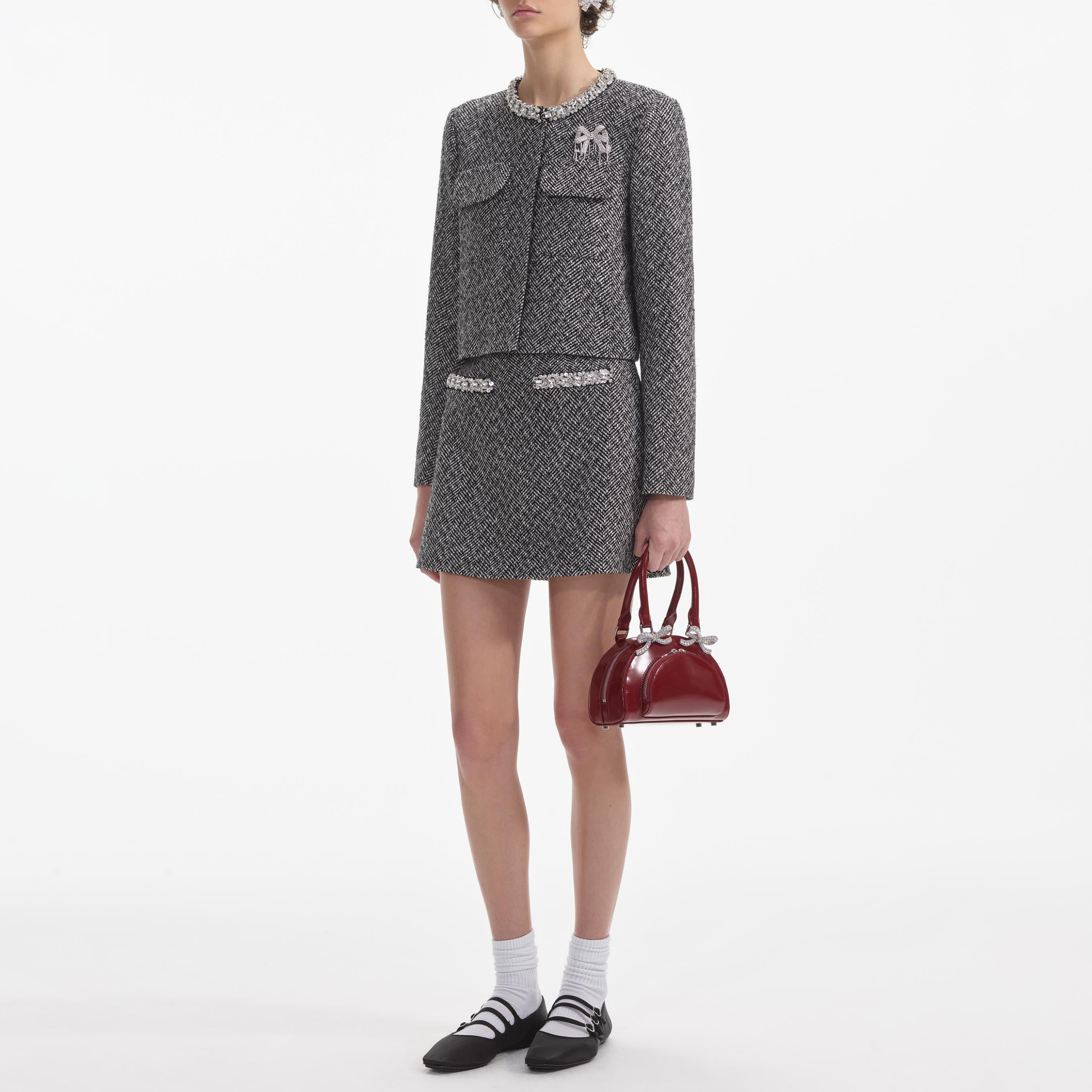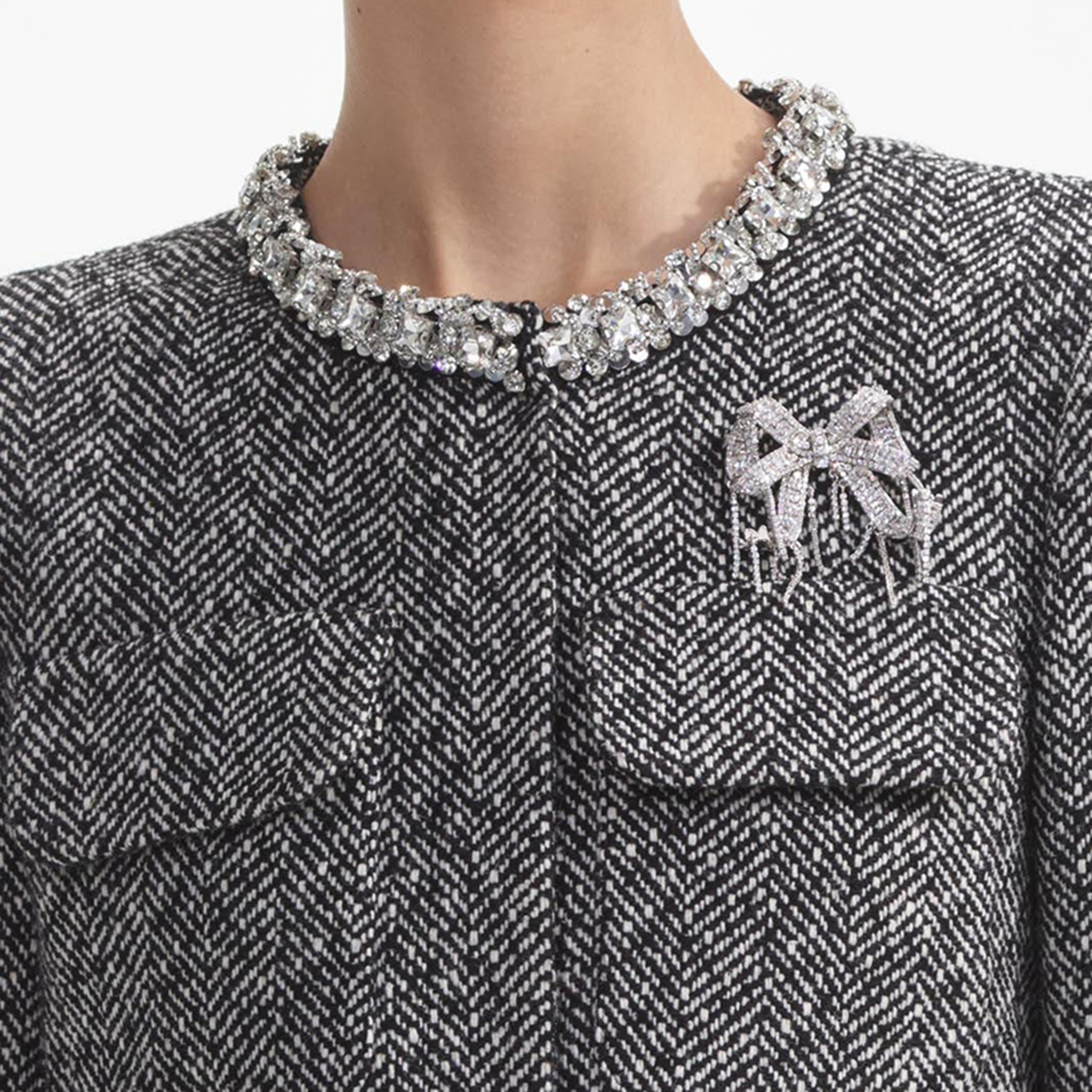 A dose of prep comes easy with this jacket, which contrasts classic herringbone in a flattering boxy cut with feminine diamanté trims. Pair with the matching skirt for a chic day of meetings.
