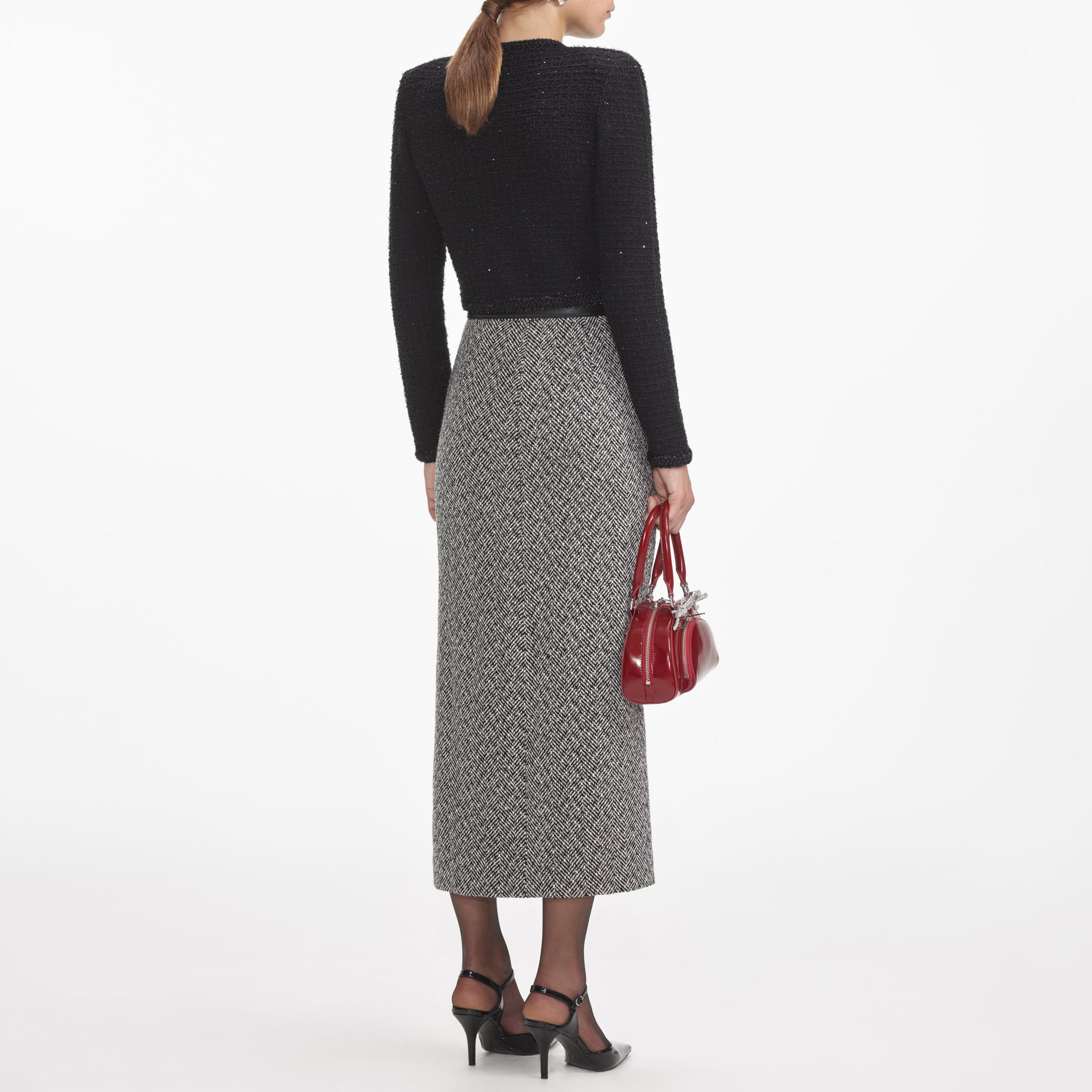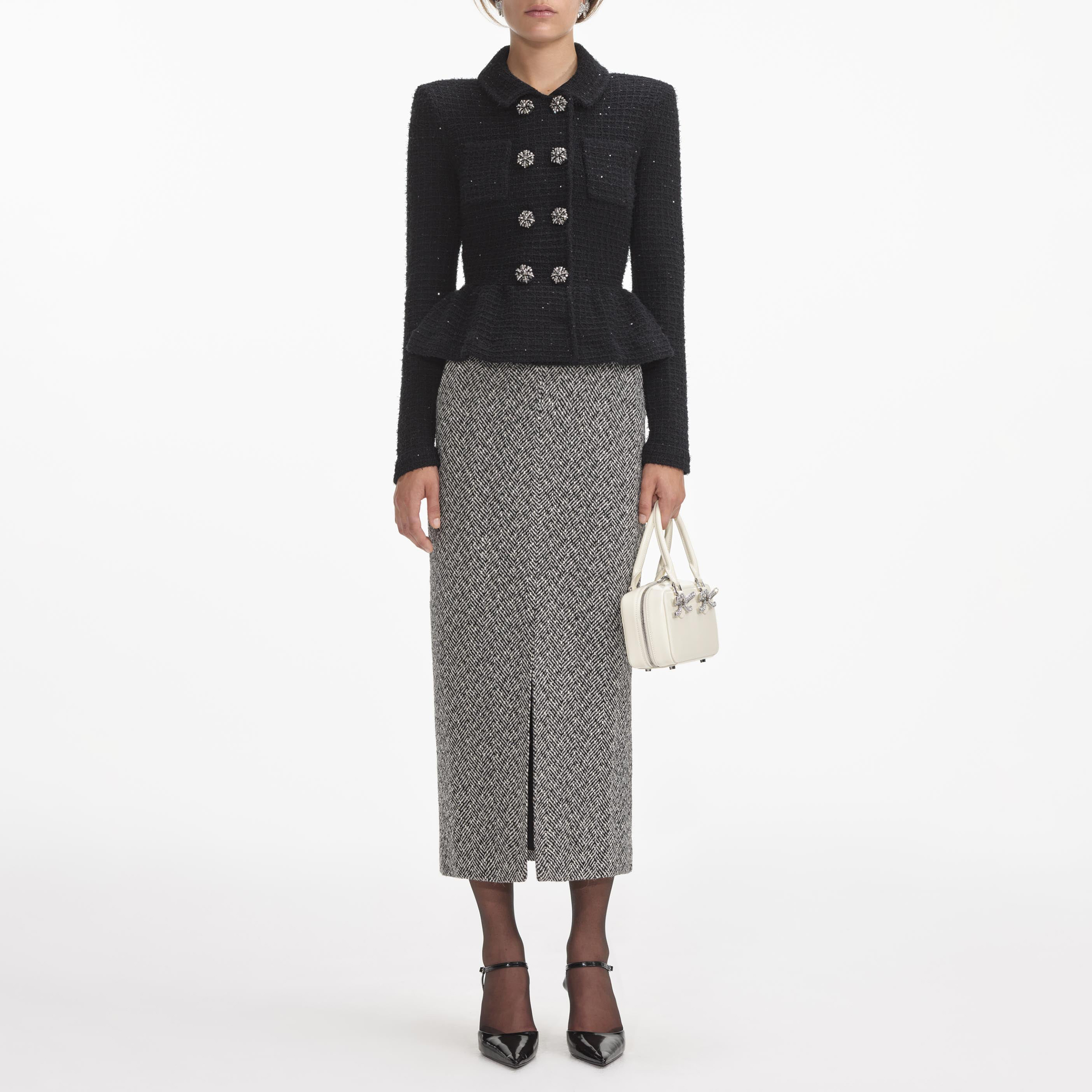 A little black jacket with ageless appeal, this piece is knitted for a cosy feel. The cropped double-breasted cut is designed to flatter – pair with the matching skirt for full impact.
