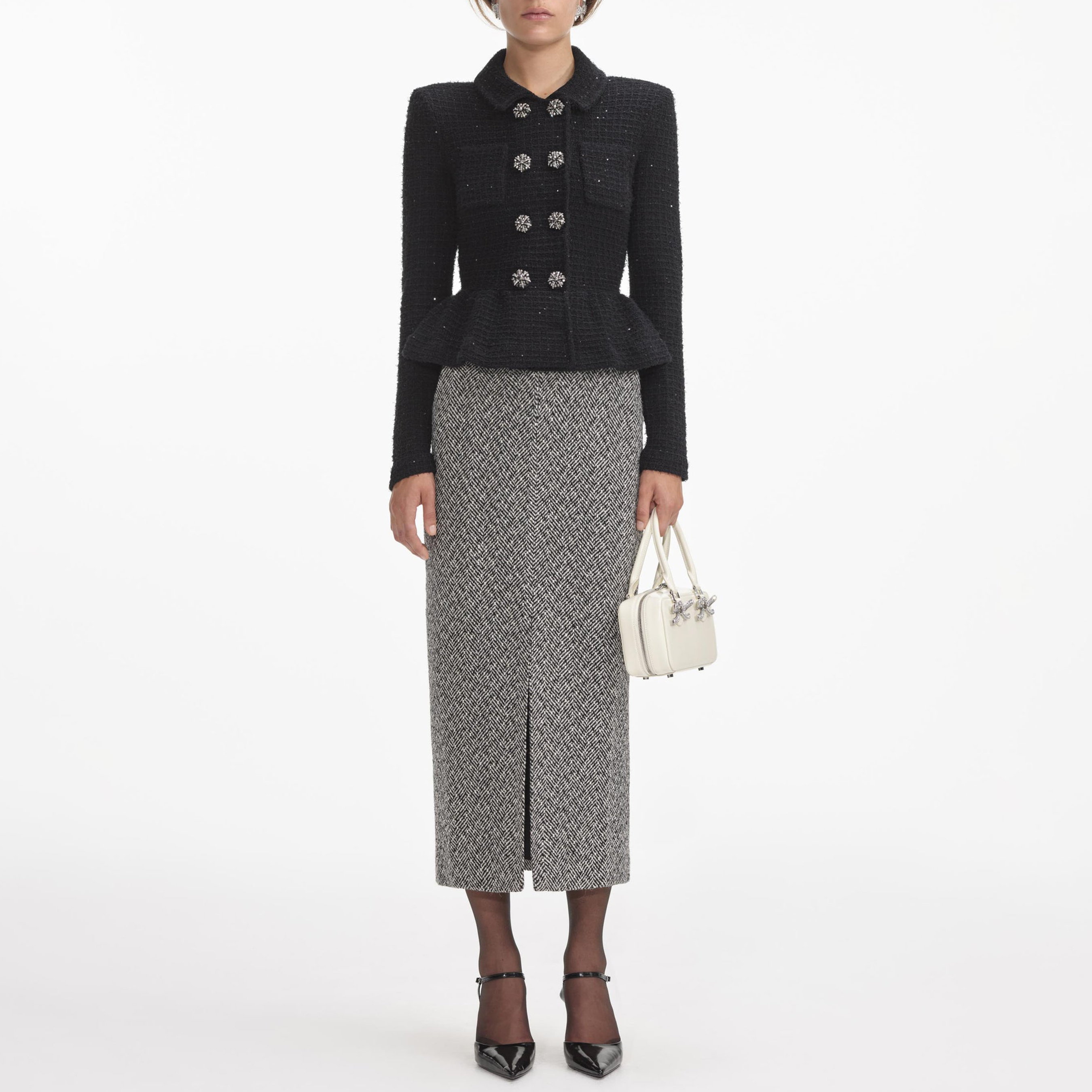 A little black jacket with ageless appeal, this piece is knitted for a cosy feel. The cropped double-breasted cut is designed to flatter – pair with the matching skirt for full impact.