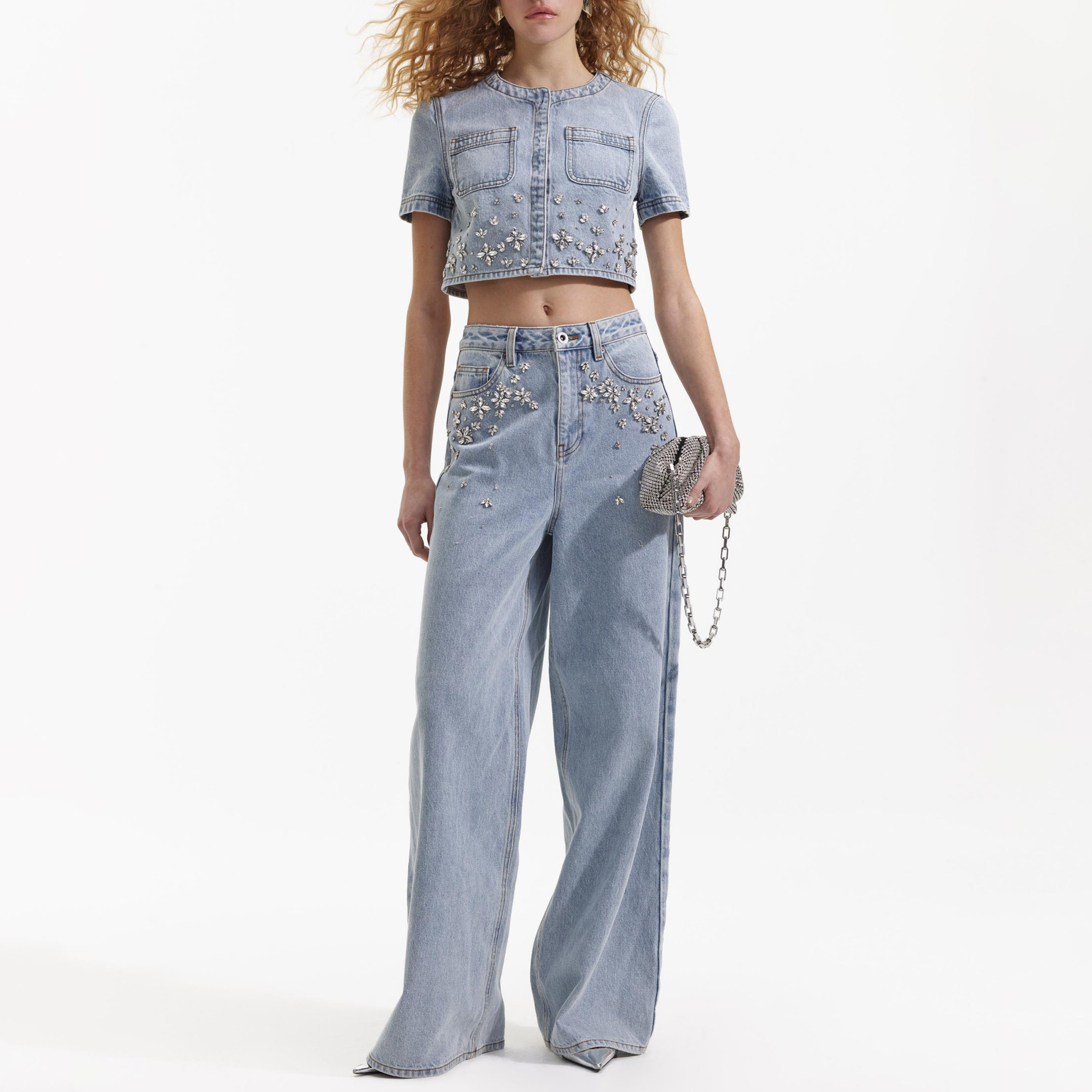 Wear-forever denim dons a party-ready finish in these rhinestone-studded jeans, which have a flattering high waist and relaxed, wide-legged fit. Perfectly easy to dress up or dress down.
