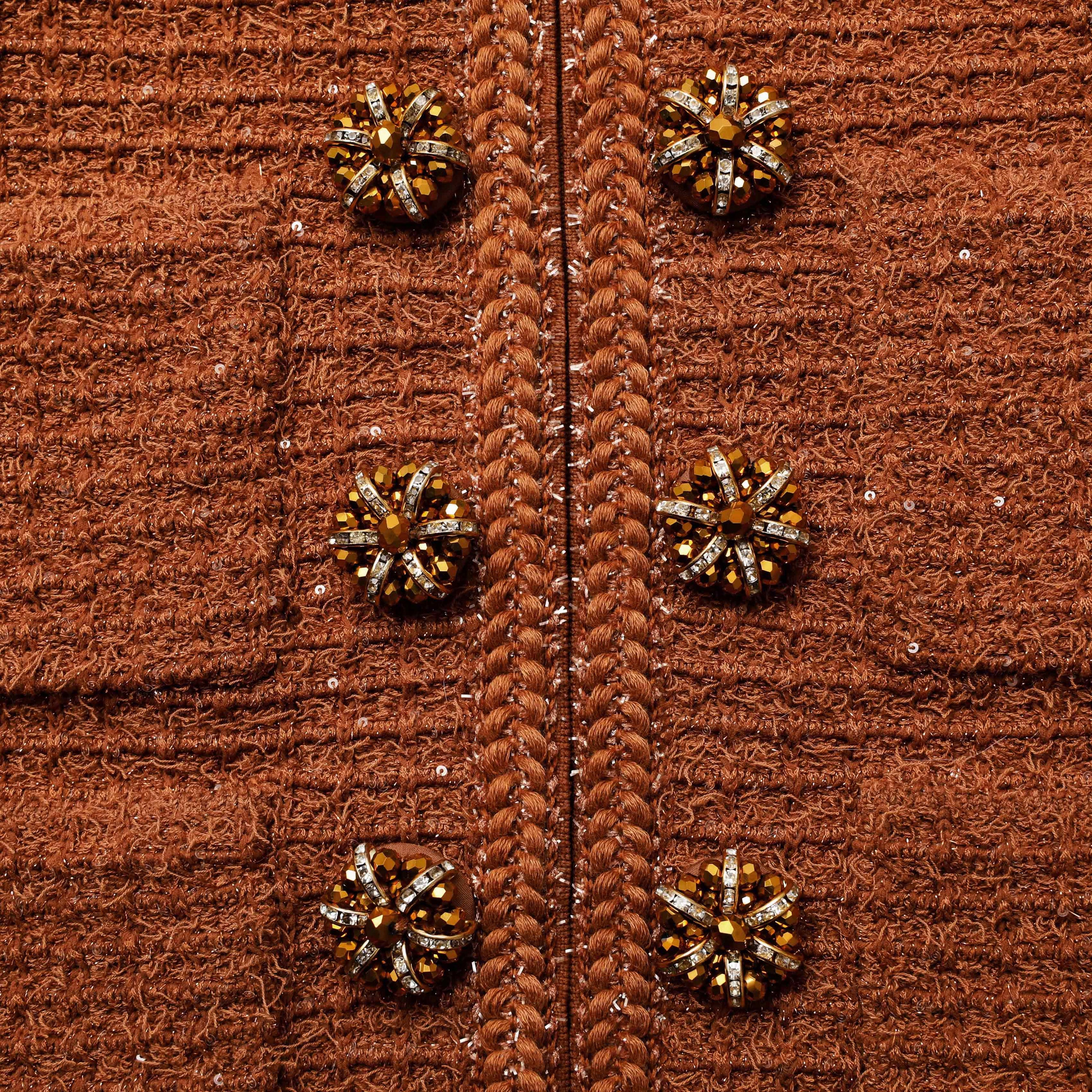 A little brown jacket with ageless appeal, this piece is knitted for a cosy feel. The cropped double-breasted cut is designed to flatter – pair with the matching skirt for full impact.