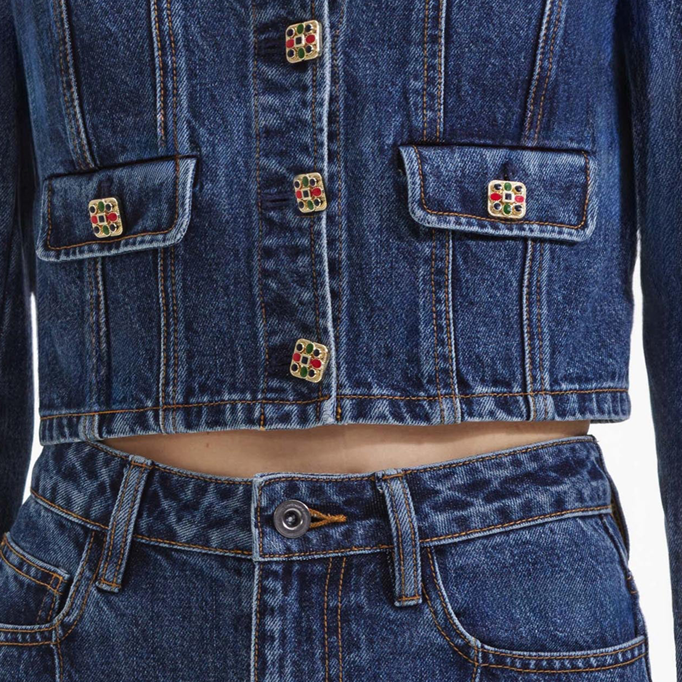 A classic with a sleek twist, this denim jacket has a flattering cropped fit. Accented with stitch detailing and gold buttons, it pairs perfectly with our matching flares for date night.