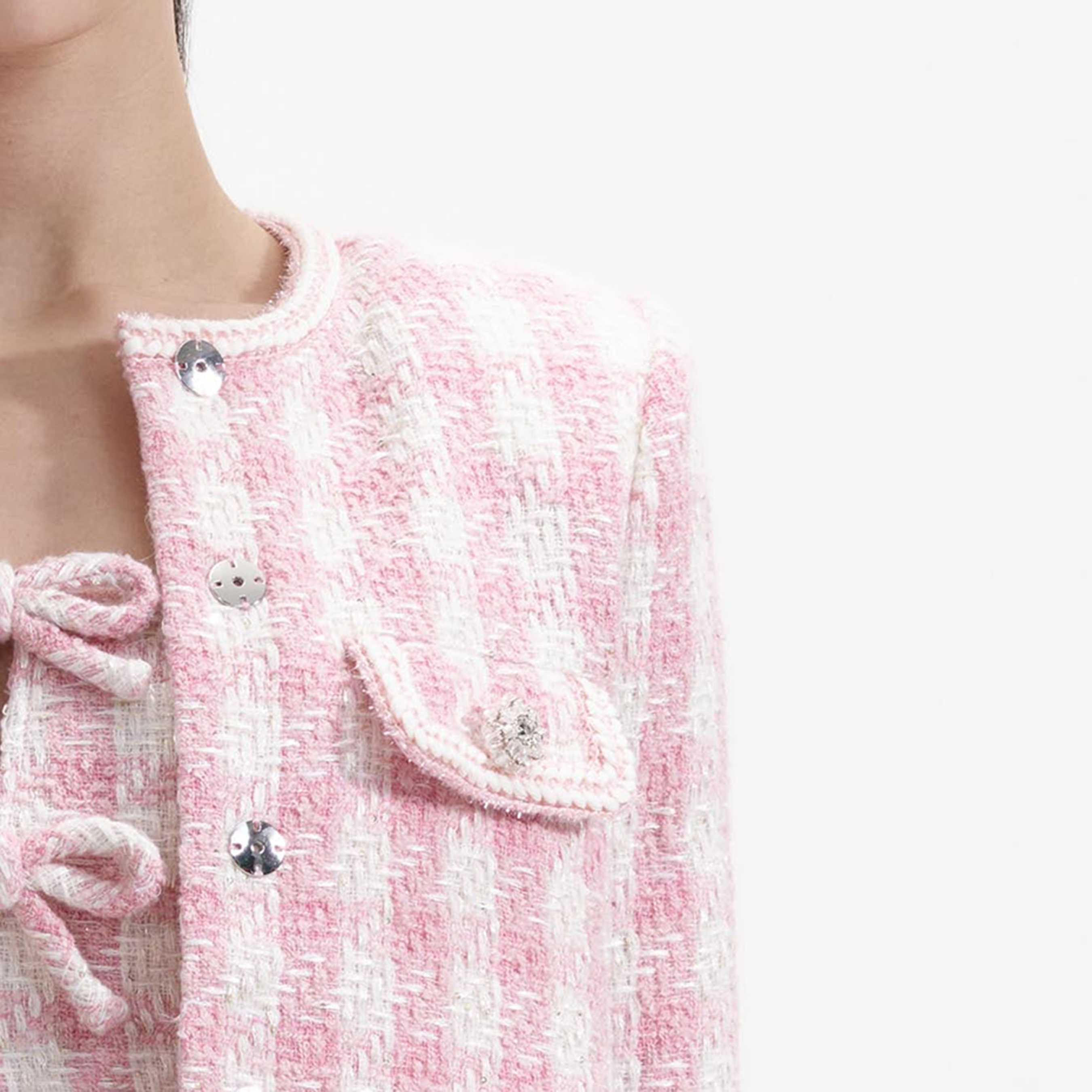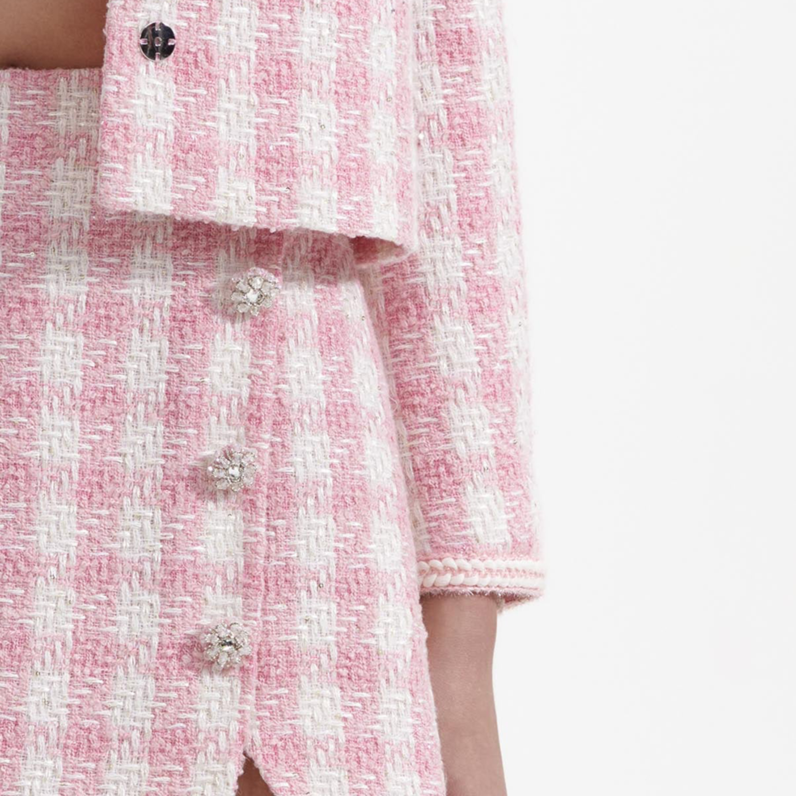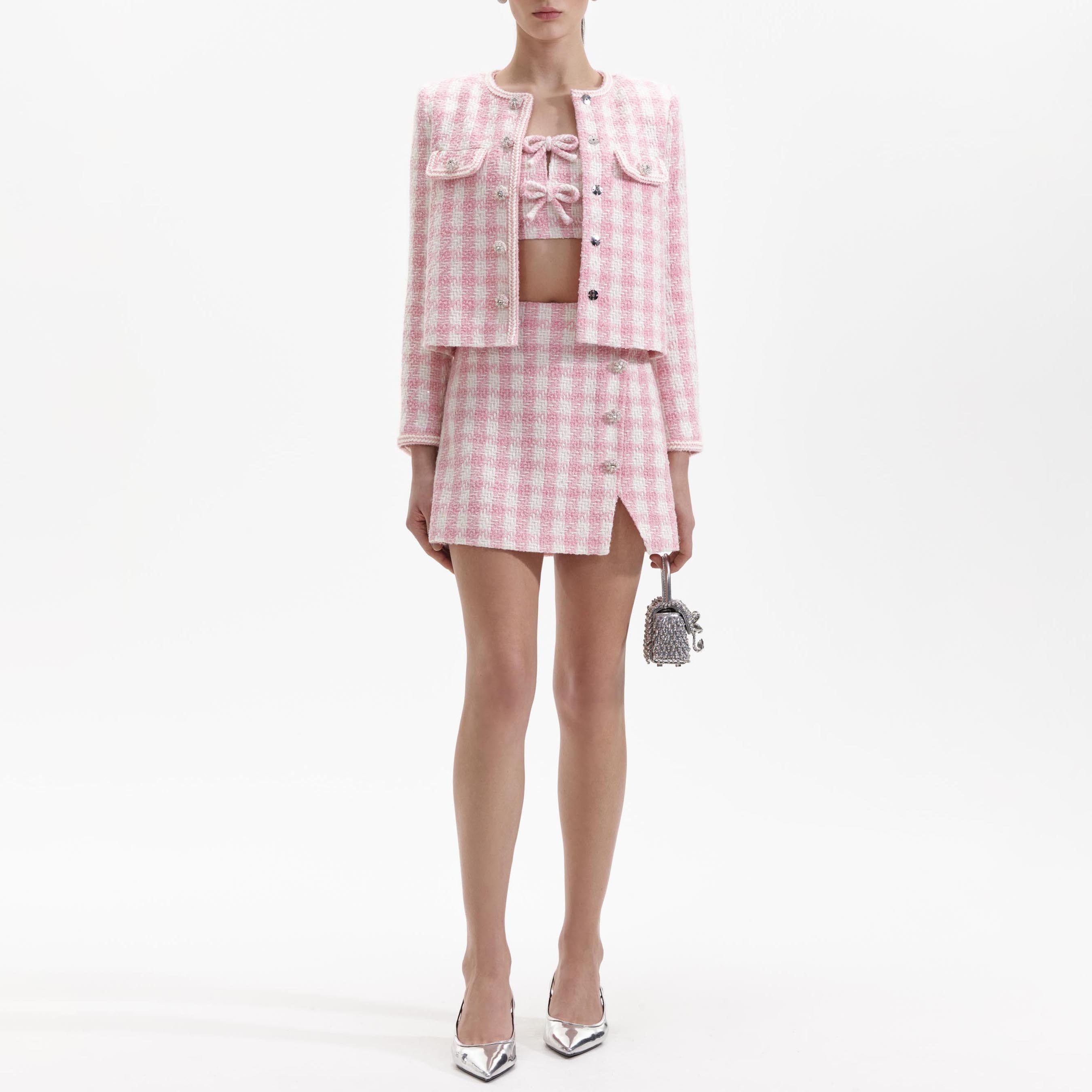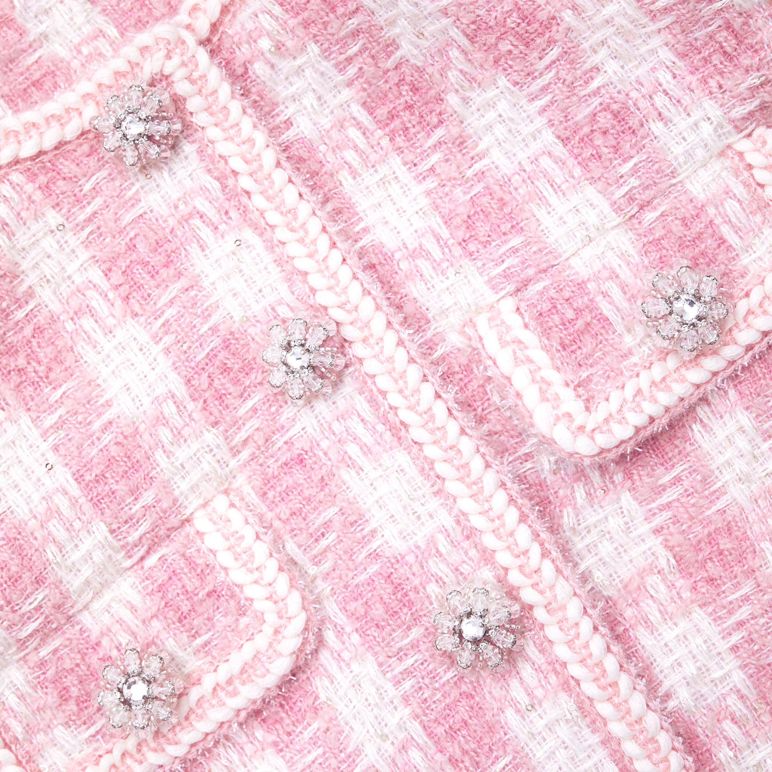 Satisfy your sweet tooth in this jacket, cut from soft candy-hued bouclé for its soft structure. Its timeless accents and boxy fit pair perfectly with our matching skirt and a glass of bubbly.