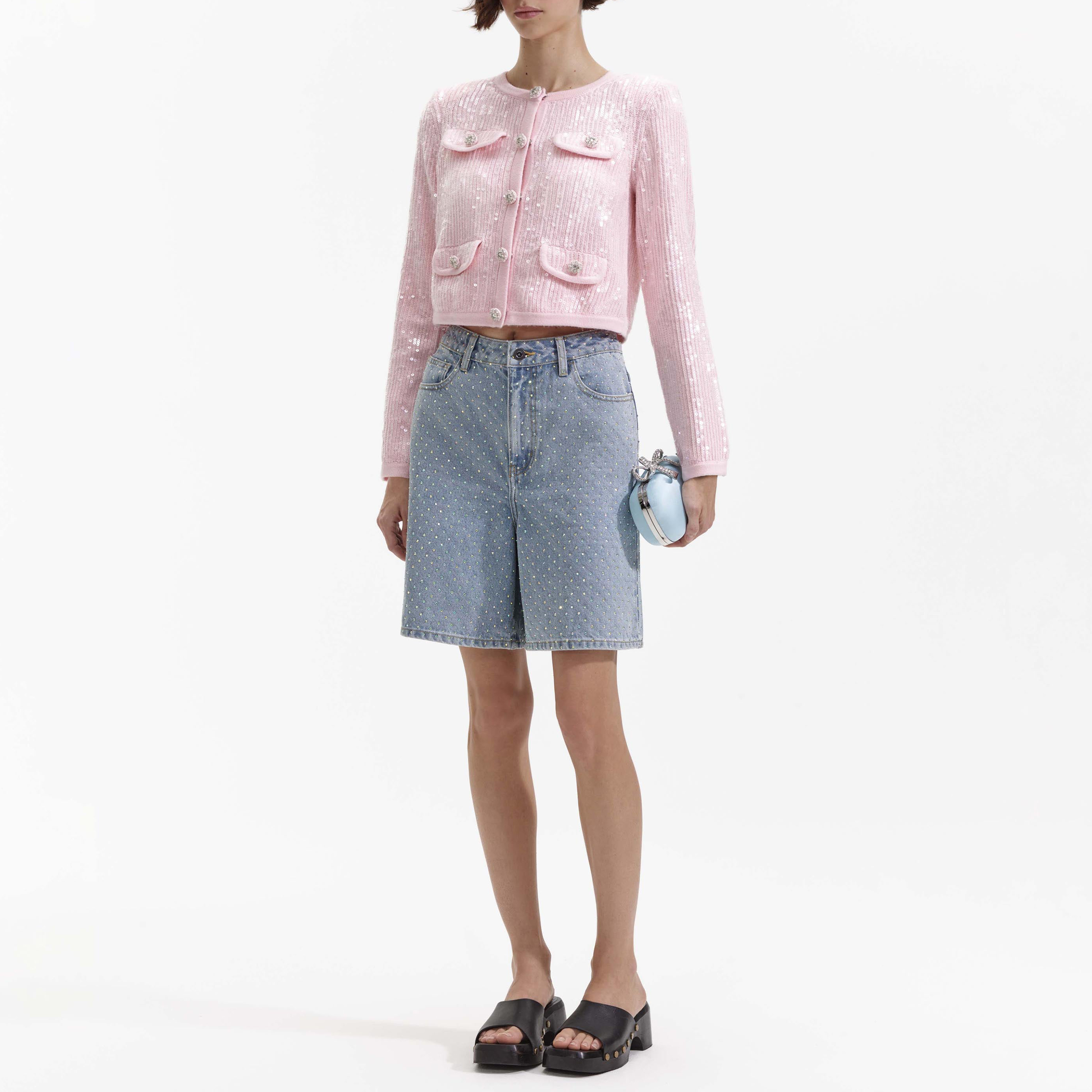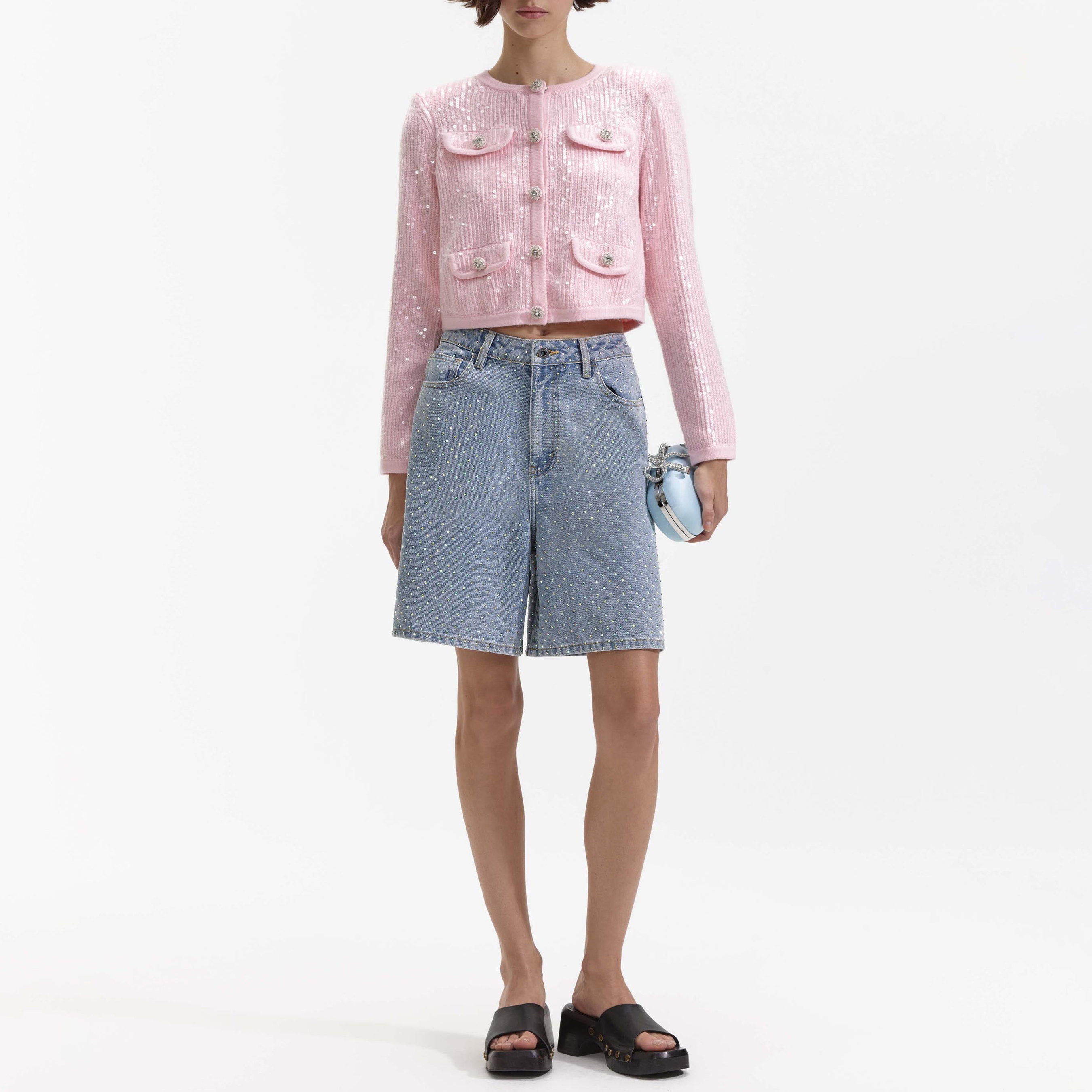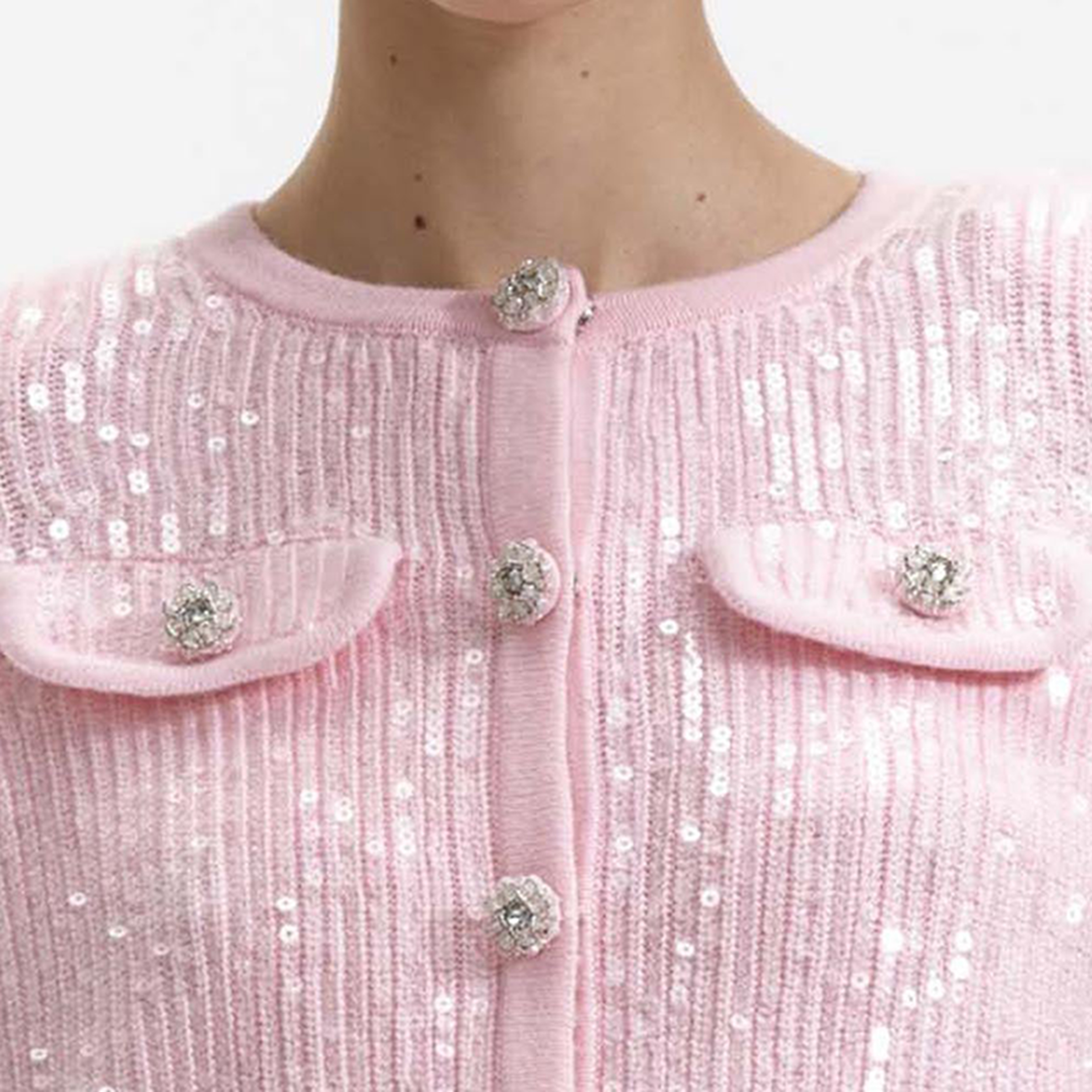 Playful and feminine, this cardigan is cut from pink sequin knit for a relaxed silhouette that'll go from brunch to cocktails. The cherry on top? Diamanté-encrusted buttons for extra shine.