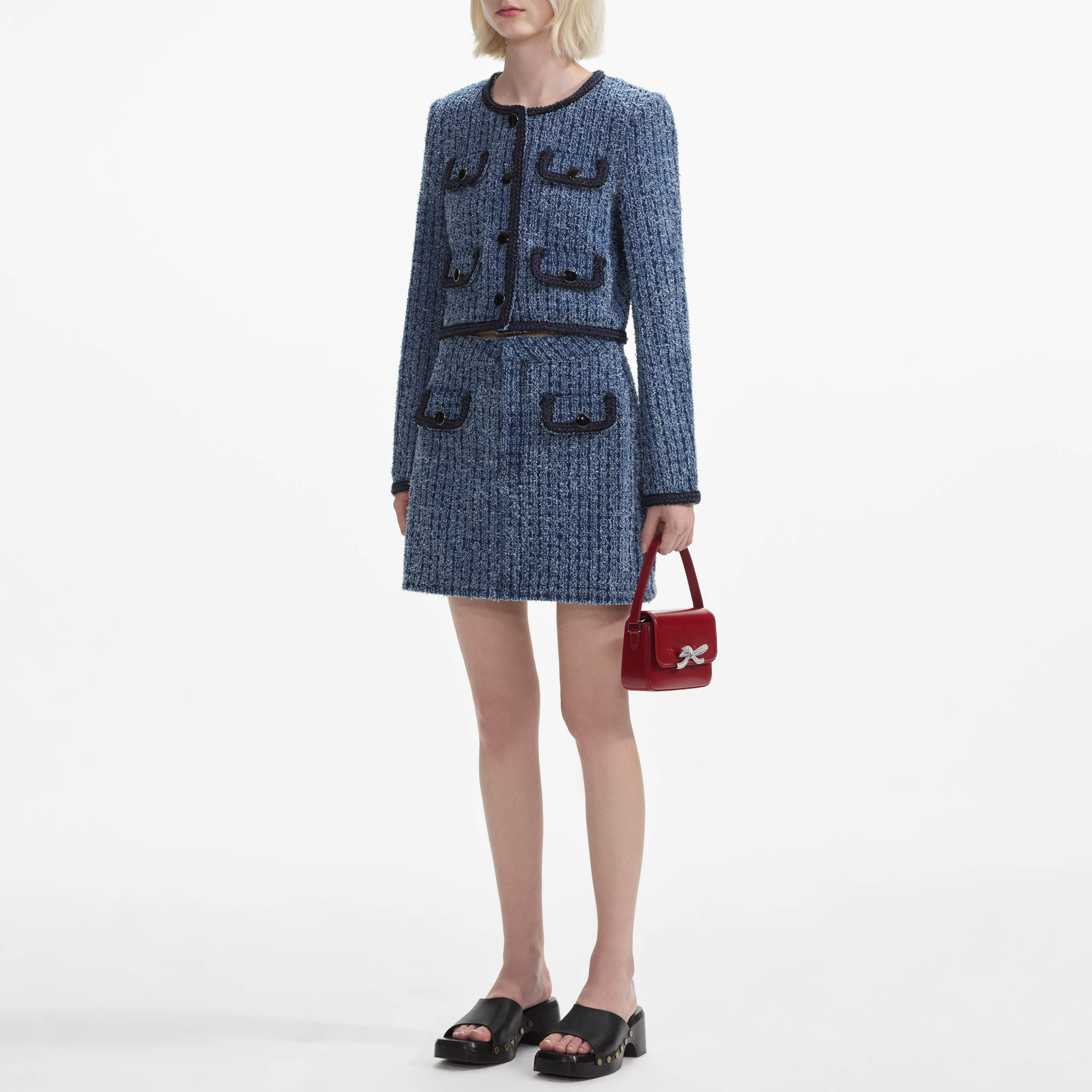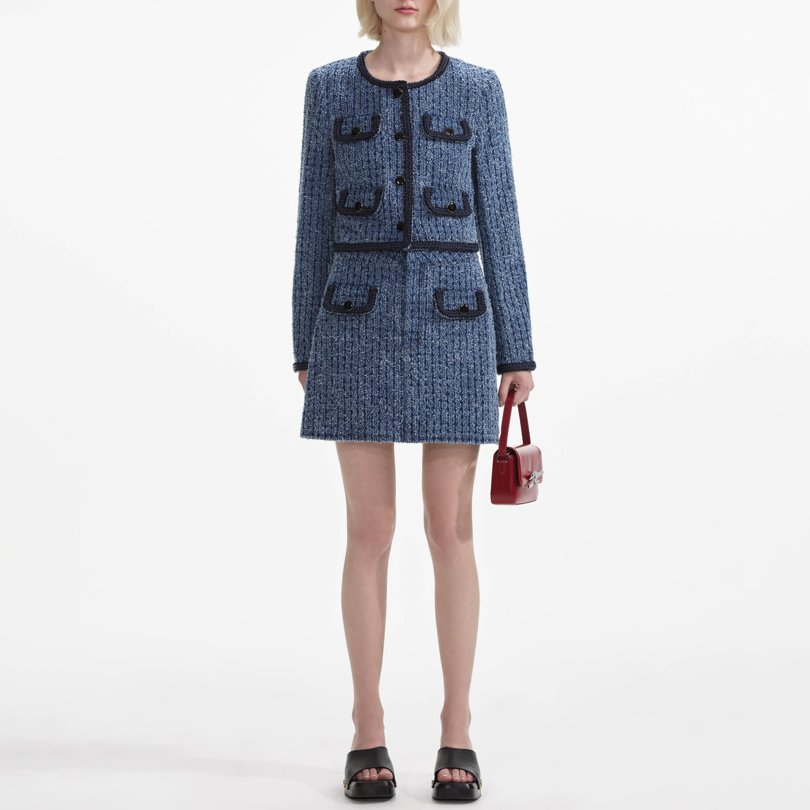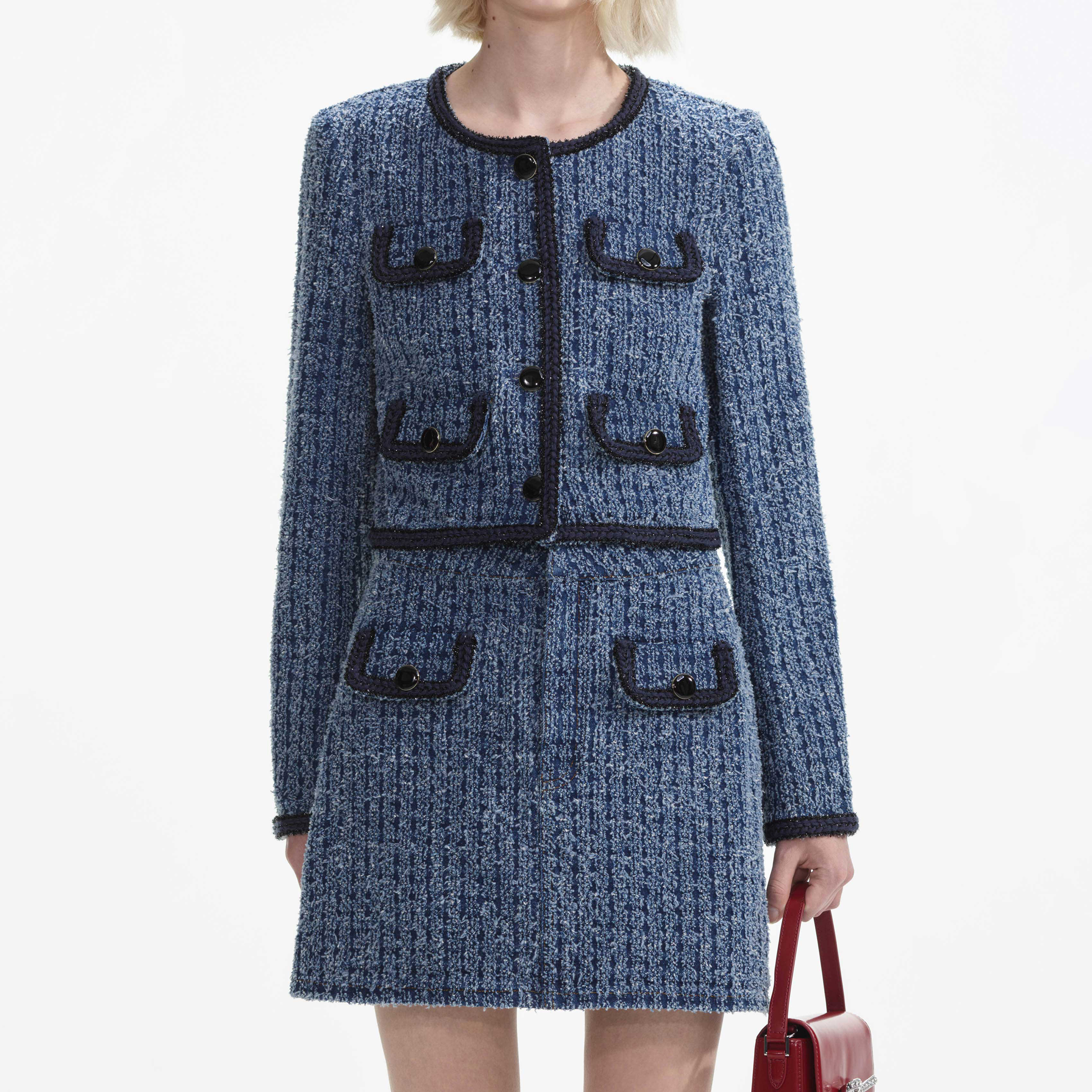 An all-American staple goes ultra-polished in this textured denim jacket, accented with black buttons and braided trims. Lean into its cropped, relaxed fit and go double denim for a weekend look.