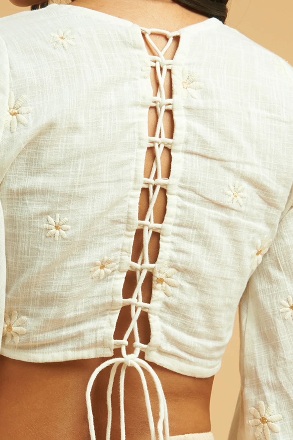 With a flattering v-neck and medium and wide sleeves, the top is both comfortable and stylish. In the back, a symmetrical fabric joins the two sides together, adding beautiful detail to the overall design. The white cotton fabric is soft and breathable, making it perfect for warmer weather.